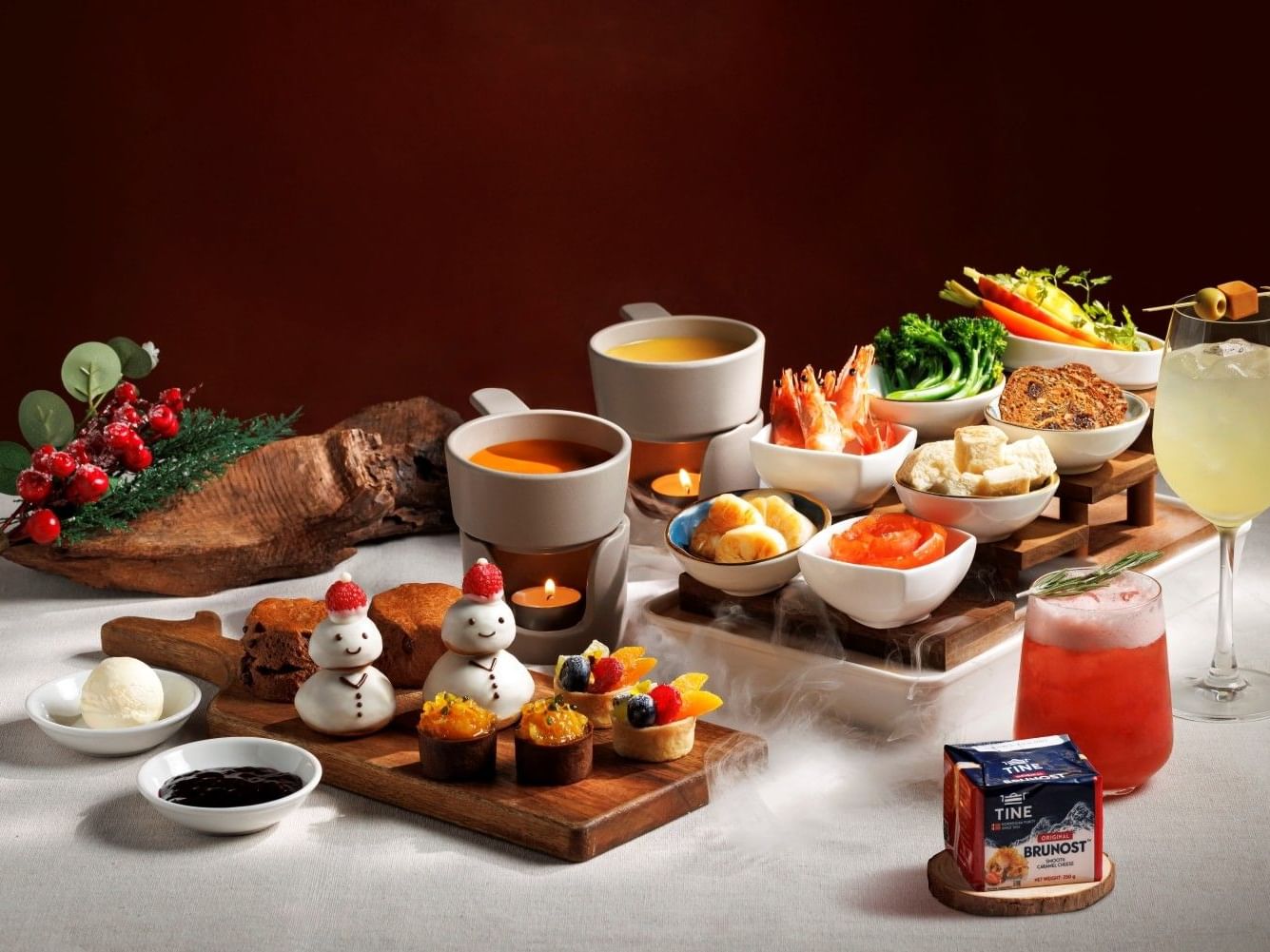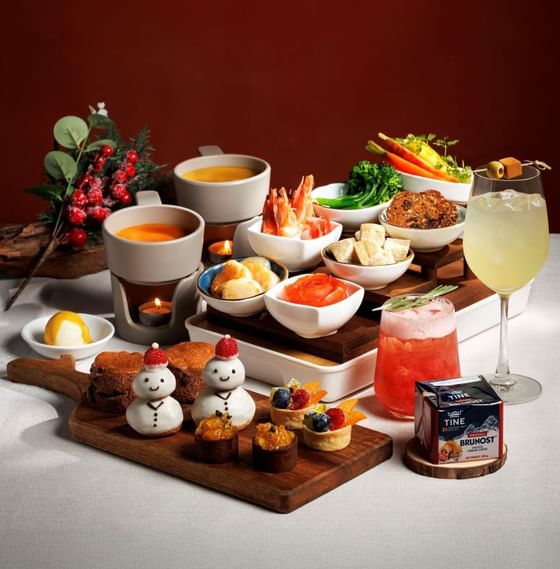 帝樂文娜公館與挪威百年芝士品牌TINE®聯乘,以其著名挪威Brunost™焦糖芝士呈獻「龍蝦焦糖芝士火鍋」下午茶,以挪威焦糖芝士融入龍蝦湯及南瓜湯,配搭各款北歐海鮮及新鮮蔬菜,展現豐盛暖心的冬日下午茶。